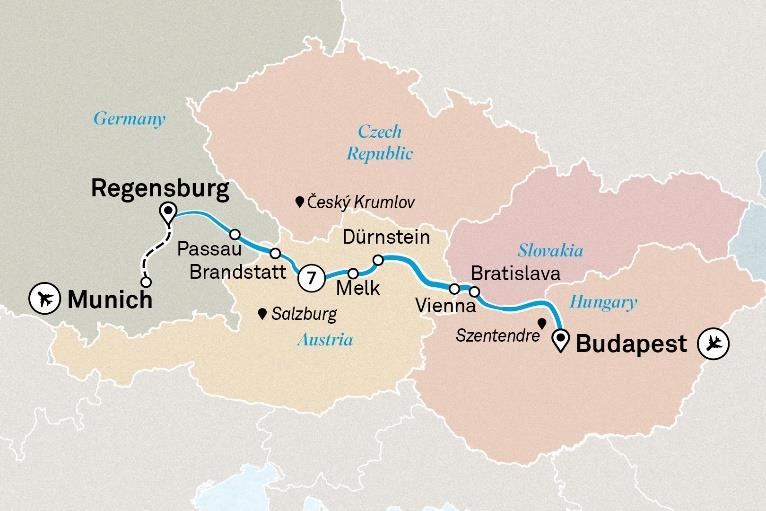 Москва → Стамбул → Будапешт / Эстергом, Вышеград, Сентендре → Братислава → Вена → Дюрштайн → Мельк → сценическое плавание вдоль долины Вахау → Брандштат → Пассау → Чески-Крумлов → Регенсбург → Мюнхен → Стамбул → Москва или С-Петербург