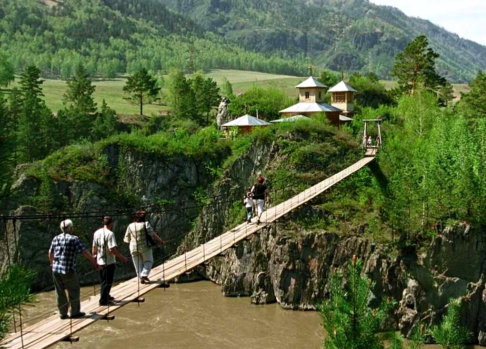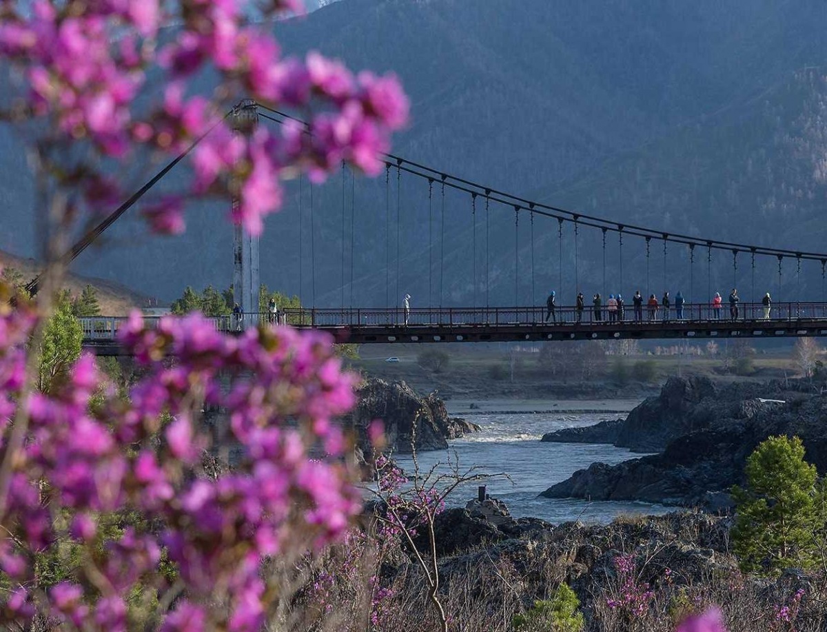 После полюбуемся скалами «Зубы Дракона», напоминающими гребень древнего ящера. Пройдём по подвесному мосту и сделаем памятные фото на фоне цветущего маральника.