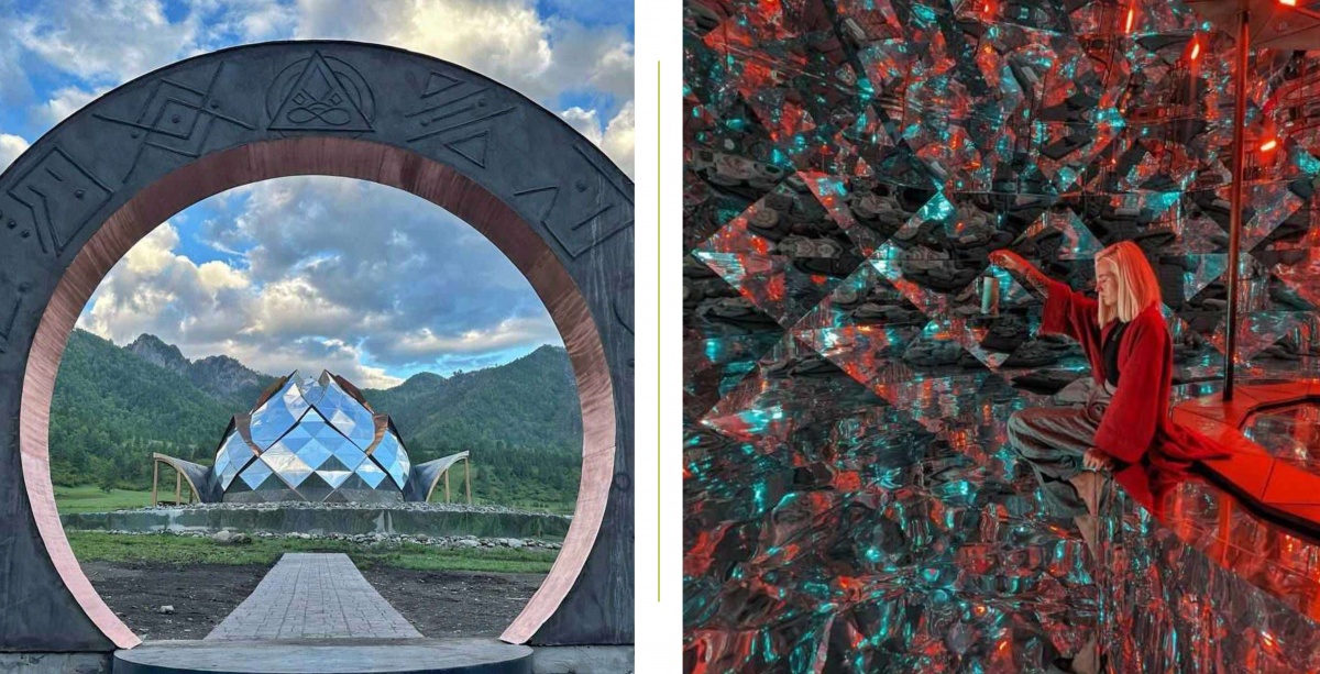 Далее нас примет Храм Звука — удивительное сооружение на берегу Катуни. Здание из зеркальных панелей, напоминающее цветок или шишку, станет пространством для акустической медитации: вы проведёте около часа в окружении завораживающих звуков хангов.