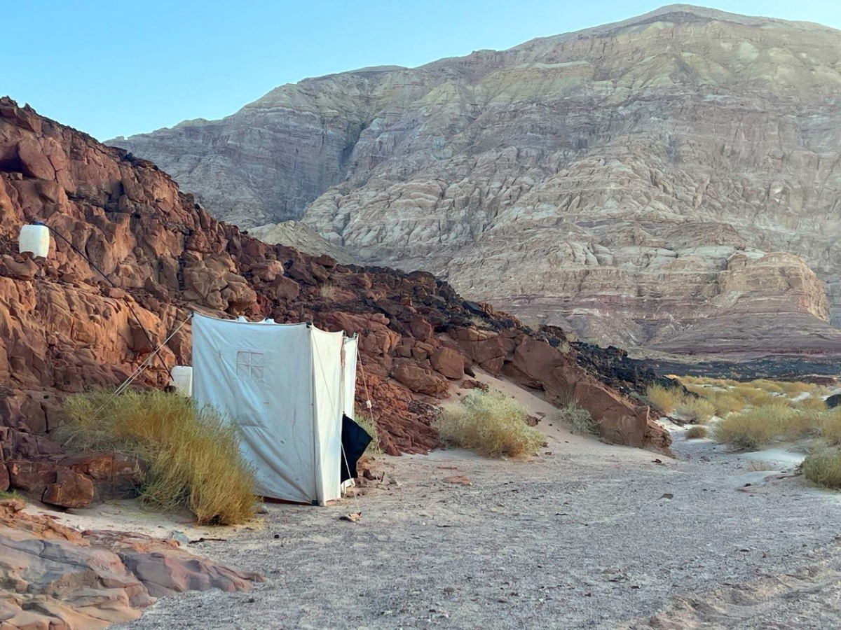 - В лагере две отдельные палатки занимают походные туалет (биотуалет) и душ (нагревается за день от солнца)