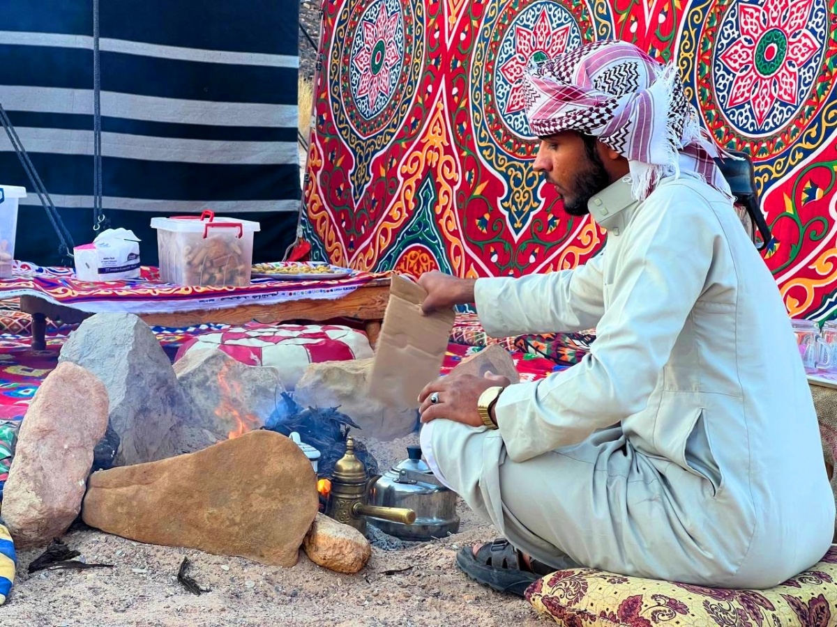6:00 Ранний подъем, утренняя гимнастика и завтрак. На завтрак бедуины приготовят для вас на огне свой пресный хлеб, а также предложат овощи, сыр, омлет, горный мед, травяной чай, кофе и всегда какой-то гастрономический сюрприз. Вас будет удивлять не только пустыня.