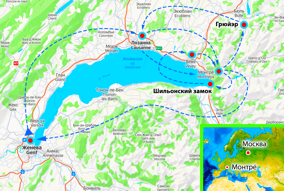 Мы будем жить вокруг Женевского озера и постоянно менять ракурс. Город, горы, вода, поезд, кораблик. Всё рядом, всё красиво и всё работает как надо. Очень по-швейцарски и, как ни странно, очень расслабляюще.